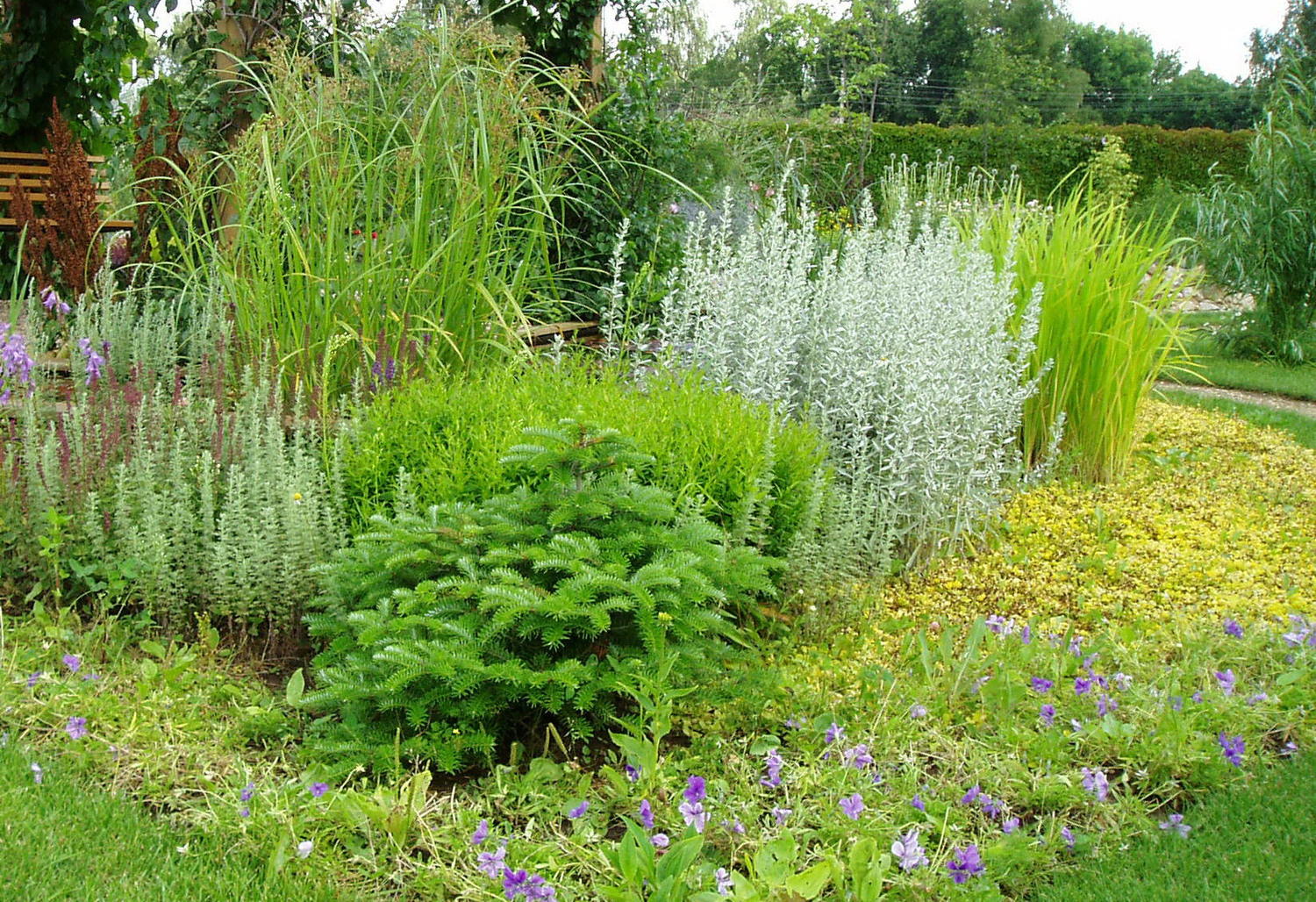 Растения подбираются таким образом, чтобы сад сохранял привлекательность на протяжении всего года. Когда одни виды отцветают, их место занимают другие. В зимнее время декоративность участка составляют хвойные и злаковые растения, а также деревья и кустарники с интересной окраской коры и необычным расположением ветвей.